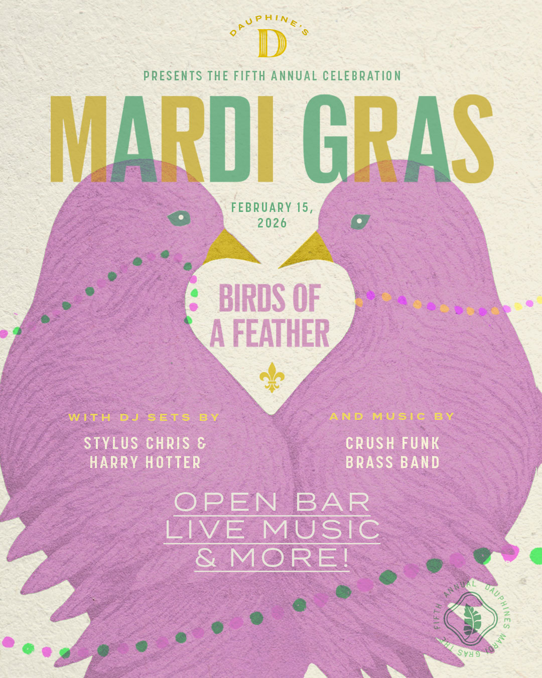 Mardi Gras at Dauphine's February 15, 2026 06:00 PM until February 15, 2026 10:30 PM Slide 1 of 10 Slide 2 of 10 Slide 3 of 10 Slide 4 of 10 Slide 5 of 10 Slide 6 of 10 Slide 7 of 10 Slide 8 of 10 Slide 9 of 10 Slide 10 of 10 Tickets are available now!